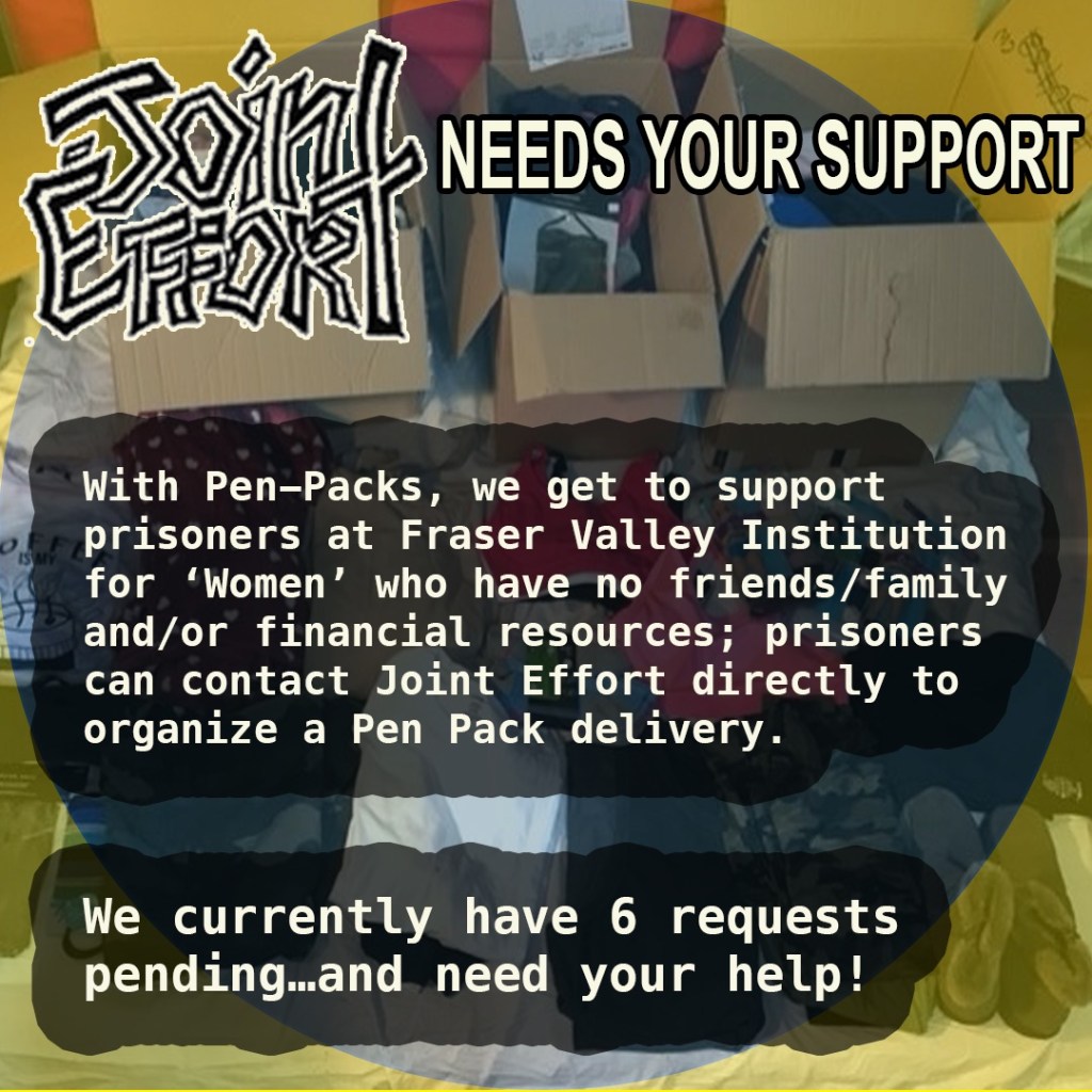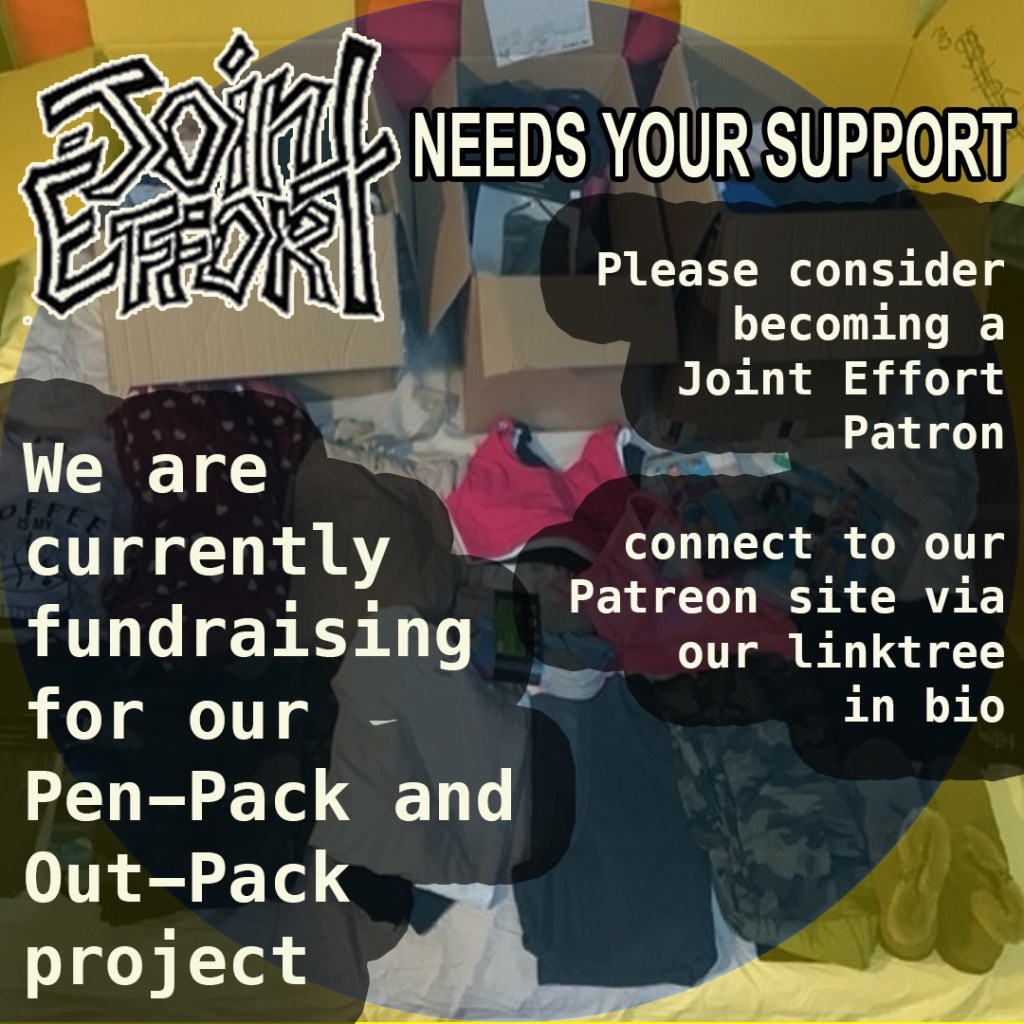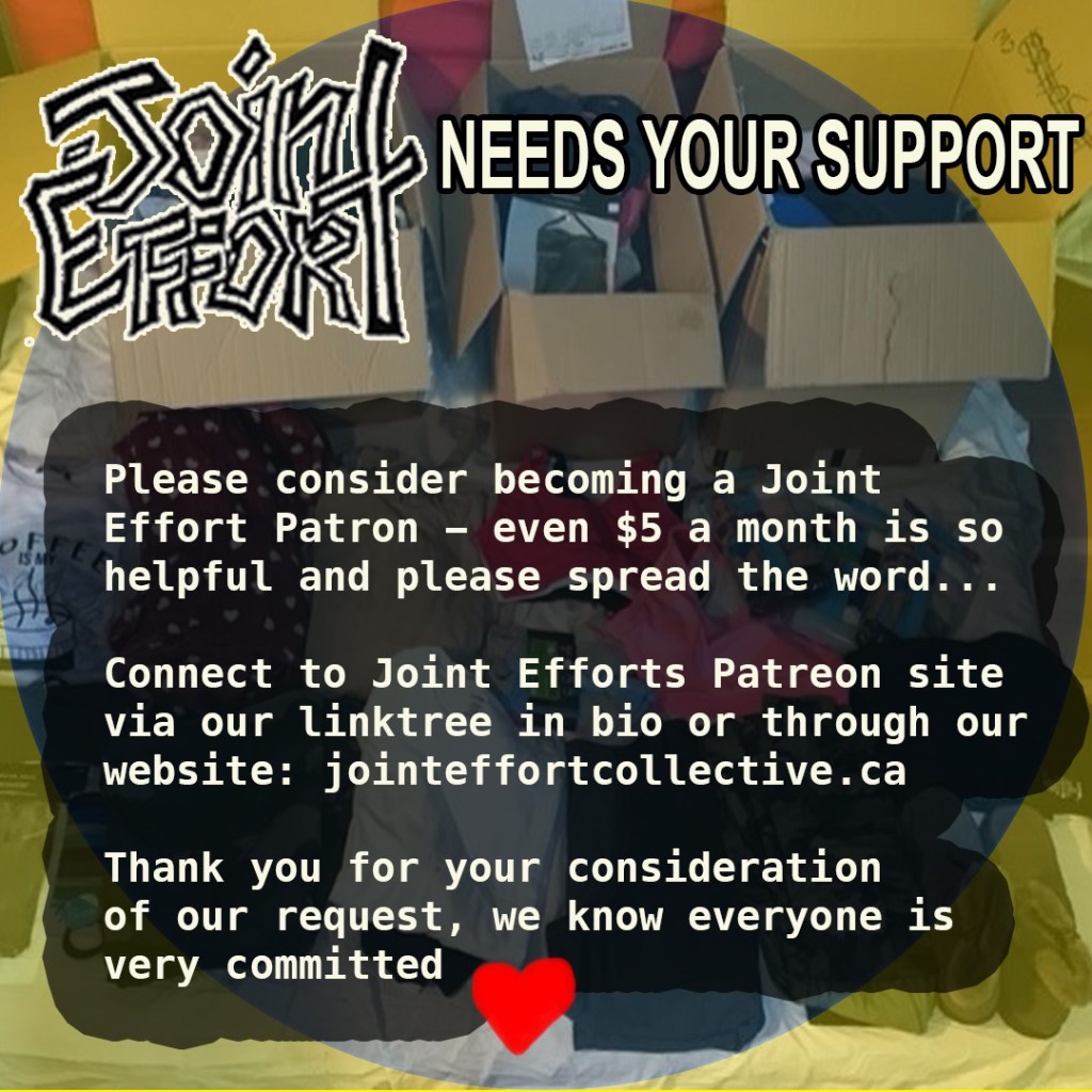 Go to our Support page for more info on how to become a regular supporter via Patreon. Joint Effort will also accept e-transfers sent to free_us_all@jointeffortcollective.ca.